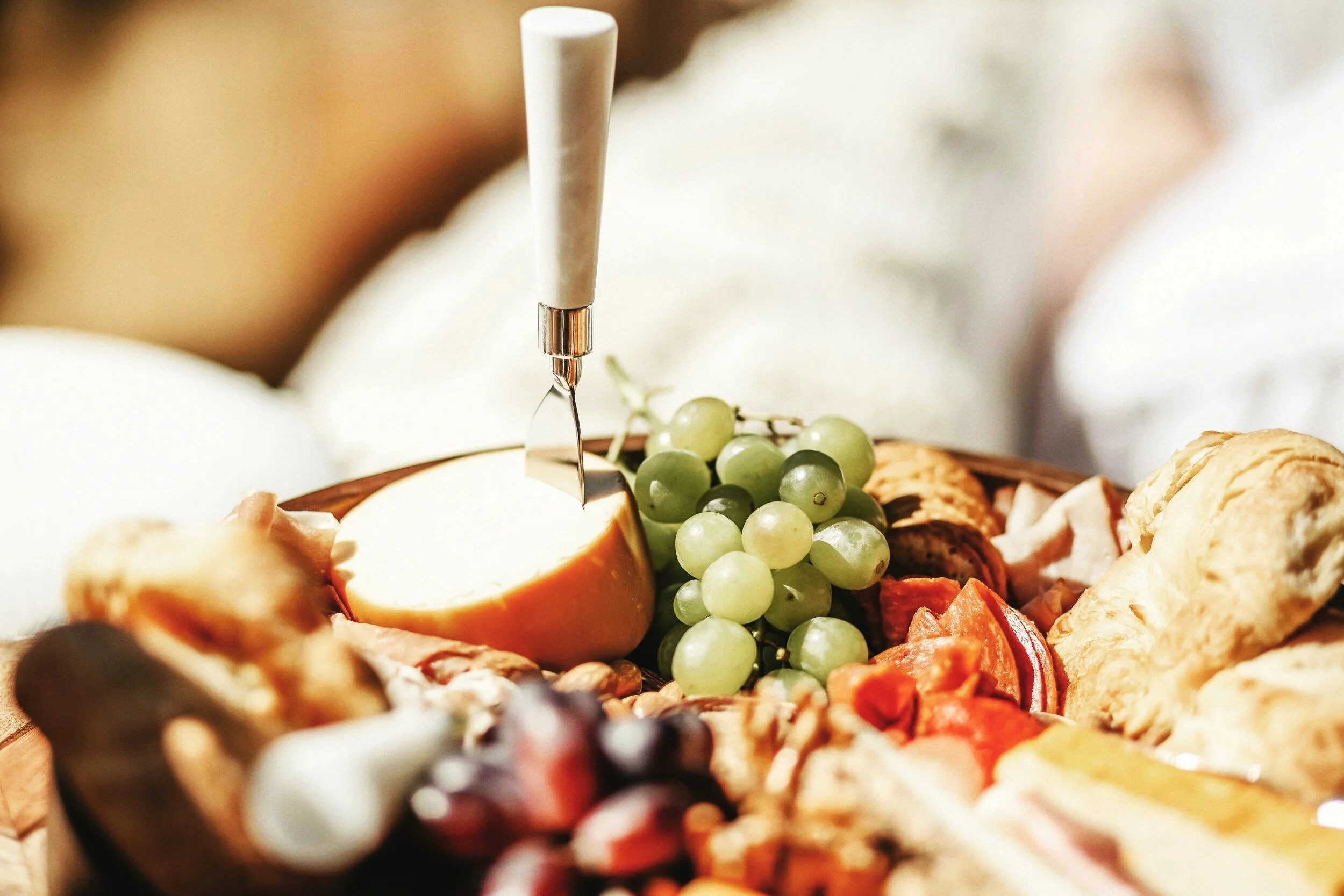Healthy colorful charcuterie boards, available for delivery to your room or for pickup.