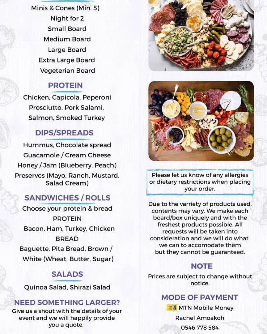 Each board or basket is made uniquely with the freshet products possible. Ingredient options include proteins, cheeses, sandwiches, rolls, fruits, vegetables, crackers, dips, spreads, salads and nuts. Due to the variety of products used, contents may vary.
